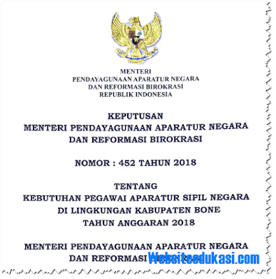 Menteri Pendayagunaan Aparatur Negara dan Reformasi Birokrasi Republik Indonesia telah mengeluarkan Peraturan Menteri Pendayagunaan Aparatur Negara dan Reformasi Birokrasi (Permen PAN) Nomor 452 Tahun 2018 Tentang Kebutuhan Pegawai Aparatur Sipil Negara di Lingkungan Kabupaten Bone Tahun 2018.